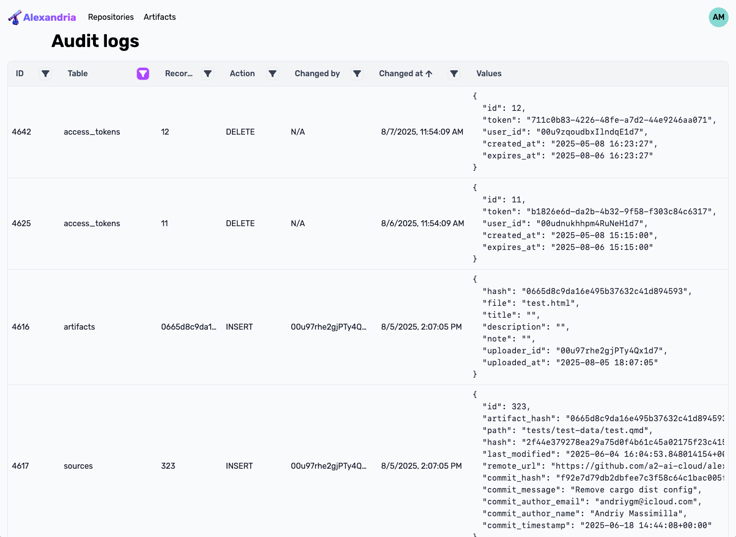 Alexandria makes it easy to find the artifacts you need, allowing you to filter and search your artifacts in a variety of ways. You can filter and sort by almost any property of your artifacts, including title, repository, author, and more. It remembers your filters and sorting preferences, so you can quickly get back to your favorite artifacts.
